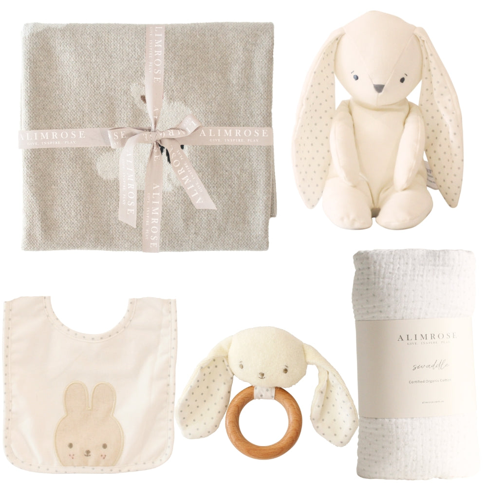 A bundle as sweet as a newborn’s first smile! This charming set is the perfect way to say “hello little one” in true Alimrose style — timeless, soft, and utterly giftable.