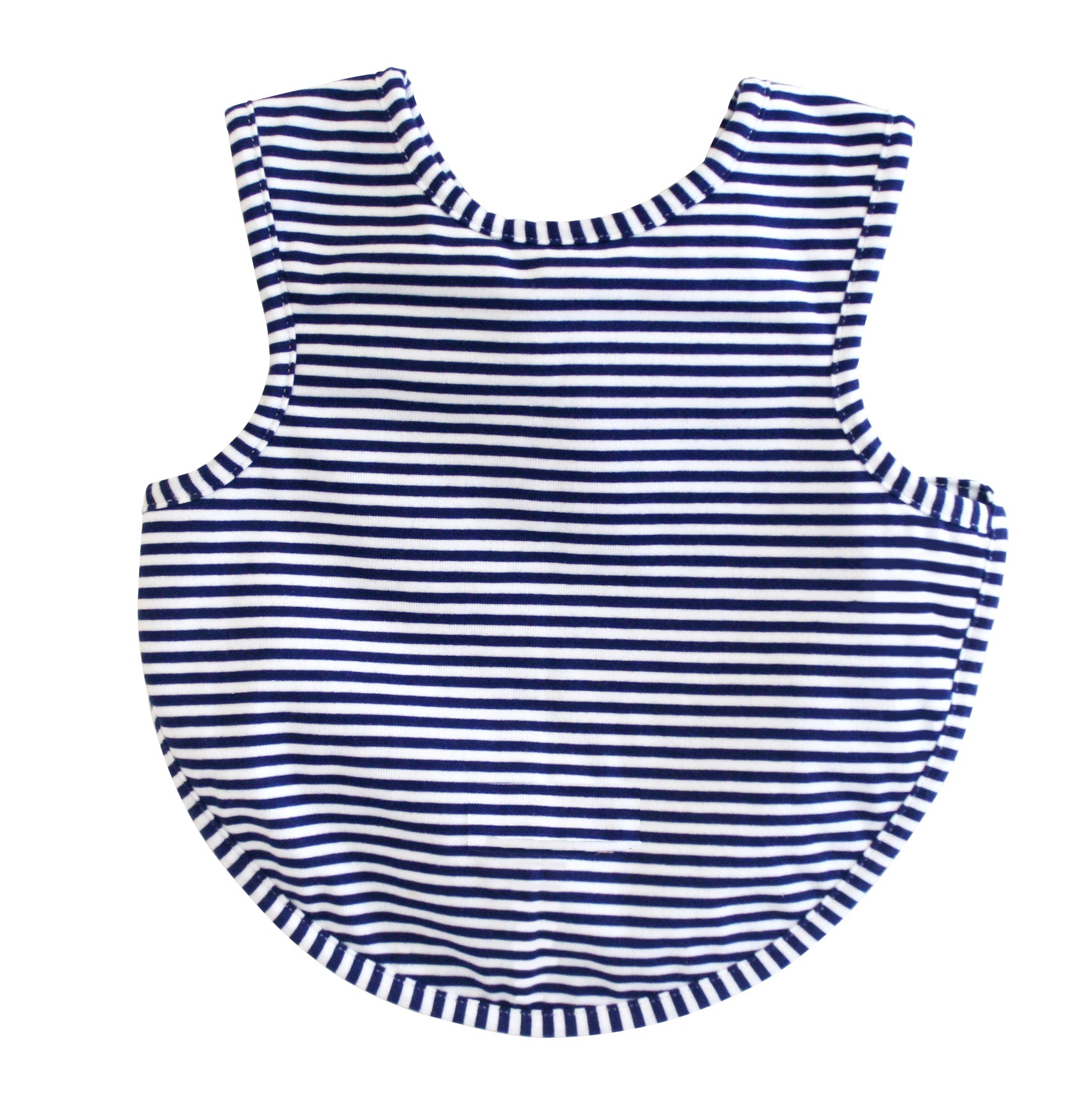 A classic and clever toddler bib. The arm holes with fastening on back make this bib tricky for little hands to remove.