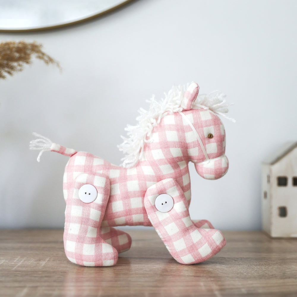 The pink gingham pattern adds a nostalgic touch, making it just as lovely perched on a shelf as it is trotting along in little hands. A keepsake for now, a playmate for later.
