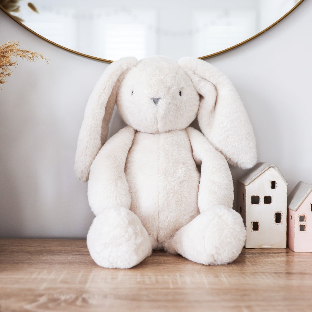 Sweet, soft, and wonderfully floppy — the Large Darcey Bunny in Ivory is the dreamiest cuddle companion. Made with extra-soft plush and intentionally lightly stuffed, this bunny has that irresistible, comforting floppiness little ones adore. Measuring 42cm (approx. 16.5”), it's perfectly sized for snuggles, naps, and everyday adventures.