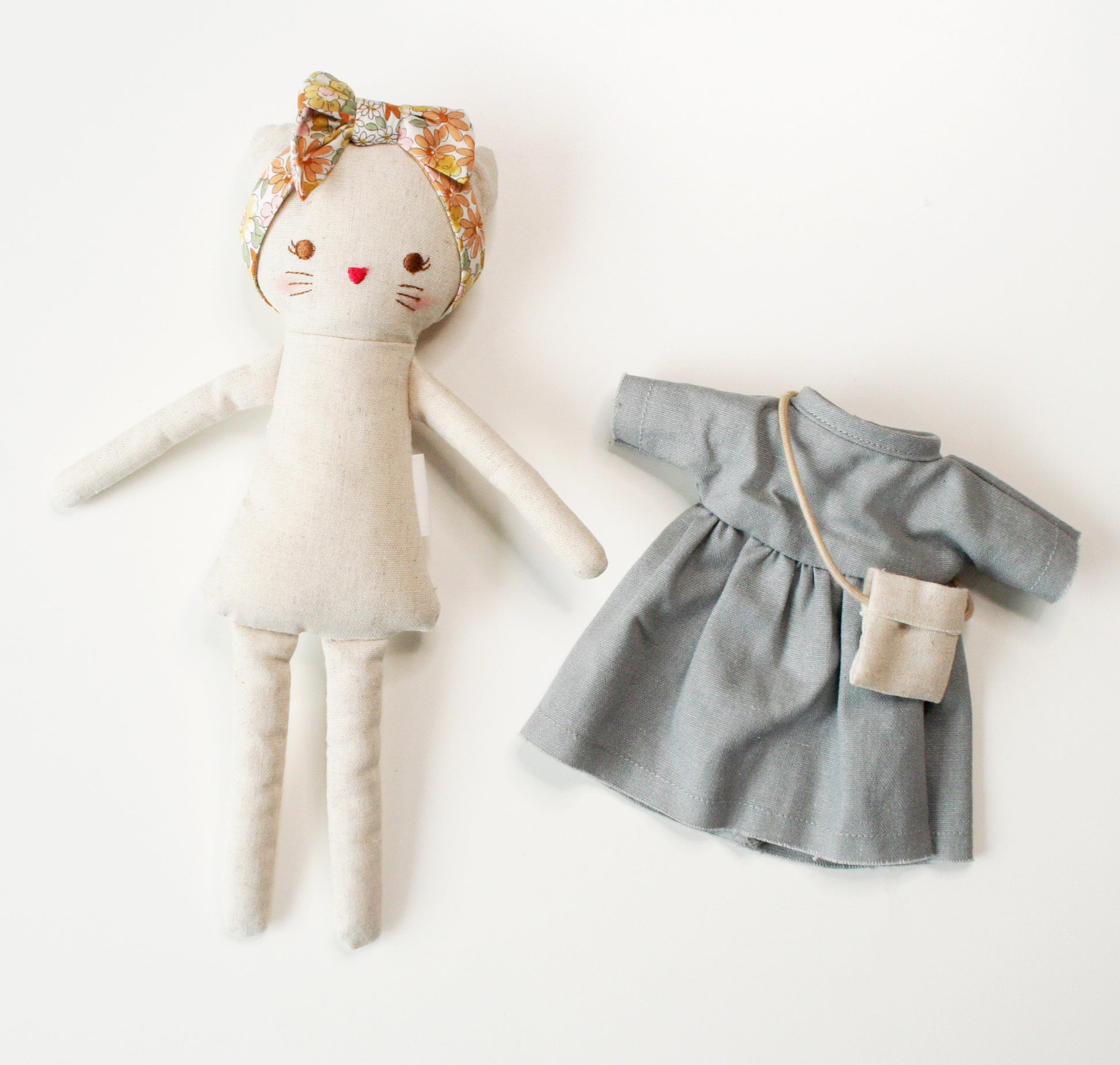 Meet Lilly Kitty, the sweetest little feline friend with a flair for fashion and fun! Dressed in a charming linen frock and a checked headband, she’s all set for a playdate — and yes, she’s brought her adorable little crossbody bag along for the adventure.