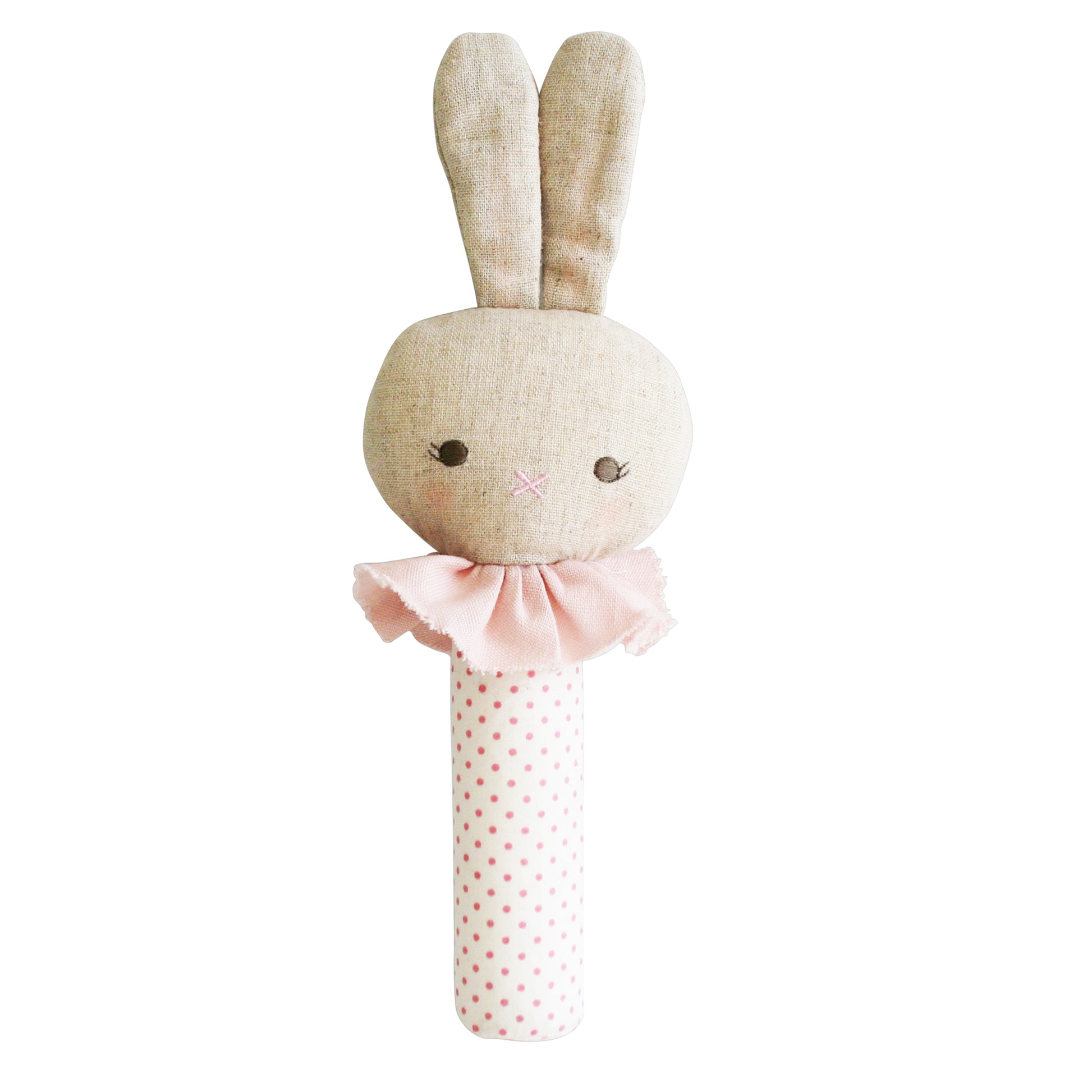 A gorgeous bunny squeaker toy. Squeaks easily when gently shaken or squeezed. A beautifully made safe toy that is perfect for young babies to explore their grasp reflex from birth & then later at around 4-5 months they are delighted by the squeaking sound & will learn to squeak independently by watching you. Squeakers are a great distraction toy! An absolute must-have in the baby bag!